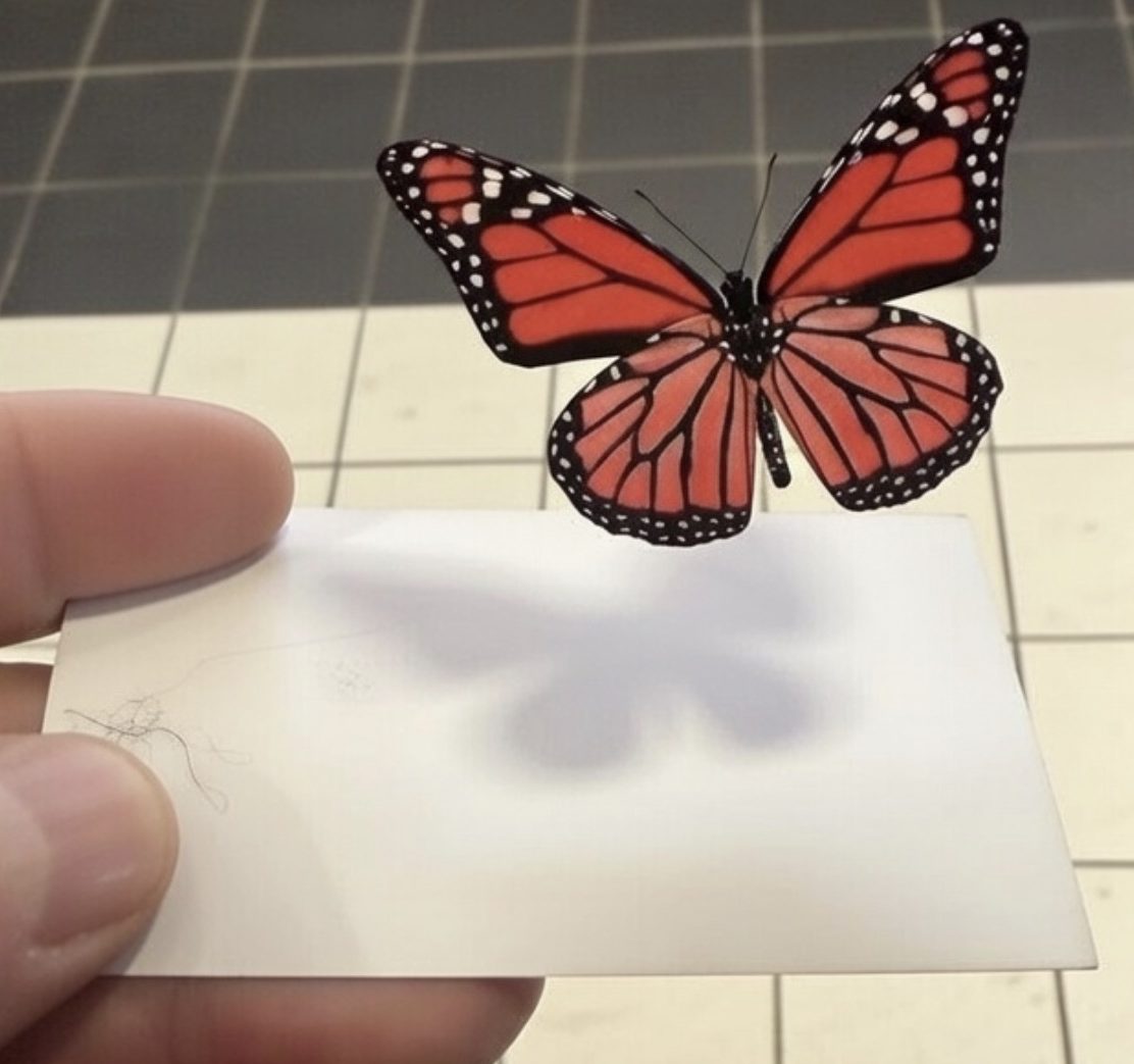 Et puis il y a ce détail qui n’en est pas un : les papillons. Sur ses cartes de visite, il en pose un au verso, comme une empreinte. Et si on le suit, ce papillon ne reste pas sage : il s’échappe, il migre, il traverse. De l’objet de com’ à l’image, du papier au mur, il devient un repère, une balise émotionnelle.